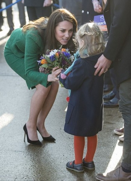 - وفى 24 يناير قامت كيت بزيارة إلى إحدى مستشفيات الأطفال فى كيدنهام، وارتدت طقماً مكوناً من قطعتين أخضر اللون، تكلف 299 جنيه إسترلينى، مع بلوزة ذات ياقة مطرزة تكلفت 158 جنيه استرلينى، من ماركة Gerard Darel.