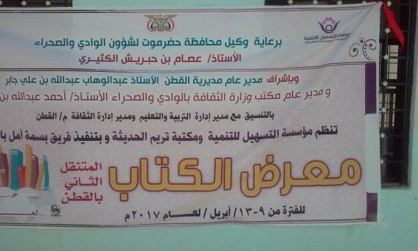 تحت شعار , إقراء لترتقي , تتواصل ولليوم الرابع على التوالي بمديرية القطن فعاليات معرض الكتاب المتنقل الثاني الذي تنظمه مؤسسة التسهيل للتنمية ومكتبة تريم الحديثة وينفذه فريق بسمة أمل التطوعي بالقطن برعاية السلطة المحلية ومكتب وزارة الثقافة بوادي حضرموت والصحراء وبإشراف من السلطة المحلية ومكتب الثقافة بمديرية القطن خلال الفترة من التاسع وحتى الثالث عشر من أبريل الجاري بقاعات مدرسة الزهراء للتعليم الاساسي للبنات , حيث يحتوي المعرض على مجموعة من الكتب القيمة ,, العلمية والادبية والثقافية والتاريخية وكتب علم الاجتماع ومهارات الطبخ والاتصال والتواصل وفن كتابة الرسائل وكتب الاطفال ,, وكذا مجلة حائطية مصممة داخل سدة أثرية تحت عنوان ,, اقليد وقالودة ,, من اعداد اللجنة الاعلامية بمدرسة الزهراء تتناول تاريخ وتراث القطن حيث لايمكن قرأءة محتوياتها الا عند فتح السدة التي تصدر اصوات مسجلة لبيت شعري ترحيبي للشاعر