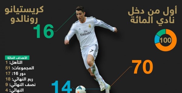 أصبح النجم البرتغالي، كريستيانو رونالدو، مهاجم نادي ريال مدريد الإسباني، أول لاعب يسجل 100 هدف في بطولات الاتحاد الأوروبي لكرة القدم (يويفا) للأندية.