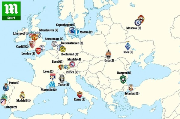 اسبانيا (41)، انجلترا (13)، ألمانيا (10)، هولندا (5)، تركيا (5)، فرنسا (4)، إيطاليا (4)، أوكرانيا (4)، البرتغال (3)، سويسرا (3)، السويد (2)، روسيا (2)، ويلز (2)، بلغاريا (1)، دنمارك (1).