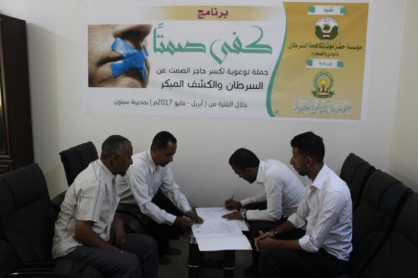 وقعت بسيئون اتفاقية عمل مشتركة بين مؤسسة حضرموت لمكافحة السرطان بالوادي والصحراء وجمعية الدعوة الخيرية مكتب سيئون لنشر الوعي والوقاية من أمراض السرطان لكافة شرائح المجتمع عبر برنامج "كفى صمتاً" لكسر حاجز الصمت عن السرطان وضرورة الكشف المبكر للحد من انتشاره والذي سيعقد خلال الفترة من (إبريل وحتى مايو) من العام الجاري، ويستهدف جميع مدارس وثانويات مدينة سيئون وتجمعات المواطنين.