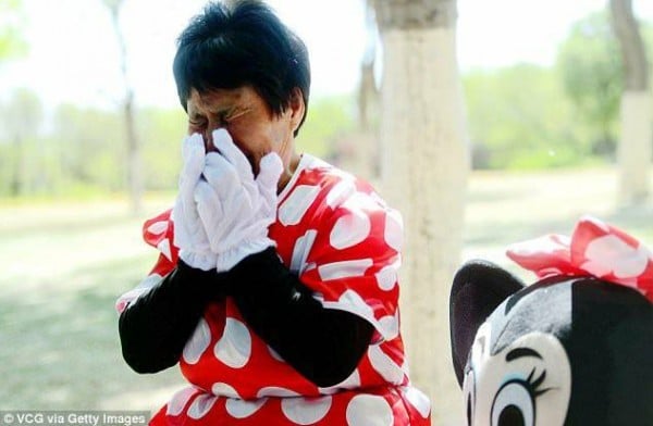 أظهرت الصور المرأة وهي تبكي بعد أن يذهب الجميع وتجلس بمفردها، حيث تقوم المرأة بارتداء ملابس "ميني ماوس" وتقف لتلتقط الصور مع الأطفال والكبار من أجل جمع المال لتتمكن من علاج زوجة ابنها المريضة.