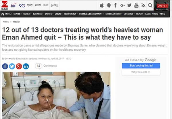 احتج 12 طبيبا من أصل 13 فى الفريق الطبى المعالج لـ"إيمان أحمد" المعروفة إعلاميا بأسمن امرأة فى العالم وصاحبة النصف طن، على ادعاءات شيماء شقيقتها، عن تدهور حالة أختها وكذب الأطباء بشأن فقدان وزنها للحصول على الشو الإعلامى، وقدموا استقالتهم عن رعاية إيمان، لكن الوحيد الذى أصر على متابعة علاجها هو موفازال لاكدويلا طبيبها الهندى الذى أشرف على حالتها منذ وجودها فى مصر وتبنى حالتها منذ البداية.