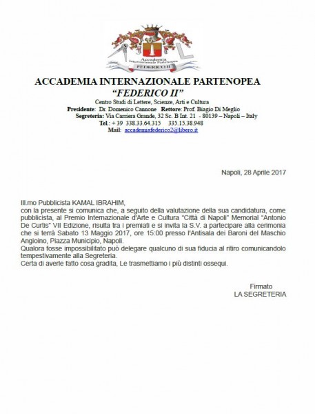 تسلم كمال ابراهيم هذا المساء رسالة موقعة من سكرتارية اكاديمية فيديريكو الثاني في نابولي – ايطاليا – تبلغه فيها رسميا حصوله على جائزة نابولي العالمية وتدعوه لحضورالاحتفال الرسمي الضخم لتسلم الجائزة مع الفائزين الآخرين وذلك بتاريخ 13.5.17 في احتفال مهيب سيقام في قاعة بلدية نابولي في ايطاليا .