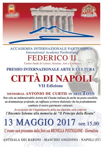 بعد تقييم ترشيحكم كإعلامي للمؤتمر الثامن للفنون والثقافة لمدينة نابولي بذكرى "انطونيو دي كورتيس"، نعلمكم بهذا انكم بين الفائزين، وبهذا ندعوكم للمشاركة بالاحتفال الذي سيقام بتاريخ 13 مايو 2017، بتمام الساعة 15:00 بصالة البارونات, ساحة البلدية, نابولي.