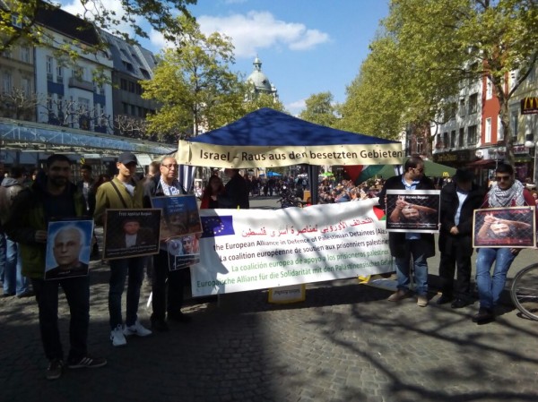 تضامنا ومساندة للأسرى في سجون الاحتلال الاسرائيلي، دعت الجالية الفلسطينية في مدين بون الى وقفة اعتصامية يوم السبت 29-4-2017 في الساحة الرئيسية في البلد فريدنز بلاتس ساحة السلام وقد احتشد ابناء الجالية, و أعضاء الجالية الفلسطينية وبدعم من مجموعة مقاطعة اسرائيل الالمانية, و إقامة طاولة معلومات حول أهمية مقاطعة اسراءيل و لإعلان تأييدهم ودعمهم لمطالب اسرى الحرية والكرامة وتم توزيع بيان باللغة الالمانية حول إضراب اسرى فلسطين