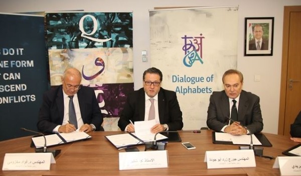 وقع رئيس غرفة التجارة والصناعة والزراعة في لبنان محمد شقير مع رئيسي جمعية "حوار الابجديات" فؤاد مخزومي وجورج زرد ابو جودة اتفاق تعاون بين الغرفة والجمعية لتبني مشروع "حوار الابجديات"، في حضور نائب رئيس الغرفة غابي تامر ورئيس الجمعية اللبنانية لتراخيص الامتياز شارل عربيد والمدير العام للغرفة ربيع صبرا ومدير حوار الابجديات ومنسقها برنار بريدي وحشد من المهتمين.