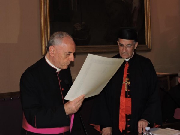 من جهته القى البطريرك الراعي كلمة توجه فيها بالشكر الى قداسة البابا فرنسيس على هذا التعيين والى محكمة الروتا بشخص عميدها وقضاتها على تنظيم هذا الاحتفال. ثم تحدث عن العلاقات بين الكنيسة المارونية والكرسي الرسولي. واعتبر ان لبنان هو الوطن الروحي للموارنة وقد انطلقوا منه الى كل العالم حيث اقاموا الابرشيات والرسالات. واضاف ان ارض لبنان هي ارض مقدسة وقد ذكر في العهد القديم من الكتاب المقدس 70 مرة فيما ذكر ارزه 75 مرة اضافة الى ذكر مدينتي صور وصيدا. ولبنان تميز بالانفتاح على كل الحضارات والثقافات في العالم وقد شكل جسر عبور بين الغرب والشرق. وفي العهد الجديد ذكر لبنان ايضا بانه ارض الكنعانيين والفينيقيين حيث كان يتردد يسوع المسيح في زيارته وقد شفى ابنة الكنعانية التي هنأها على ايمانها وكان يبشر في نواحي صور وصيدا. وفي مدن لبنان تكونت الجماعات المسيحية الاولى . كما ان هذه المنطقة الشرقية من العالم اعطت للكنيسة 5 بابوات. واعتبر غبطته ان لبنان يشكل قاعدة ثقافية وحضارية قامت عليها المسيحية قبل الاسلام بـ 600 سنة ومنه انتشرت الى كل العالم.