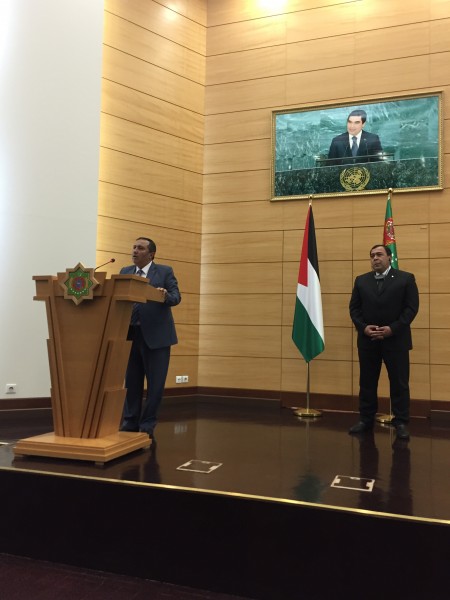 وتم افتتاح الحفل بكلمة من وكيل وزارة الثقافة التركمانستاني الذي عبر عن سعادته العارمة بإحياء الذكرى الخامسة والعشرين لبدء العلاقات بين البلدين الشقيقين الذين تربطهما علاقة تاريخية وثقافية ودينية عميقة. كما ألقى سفير دولة فلسطين لدى تركمانستان د. حسين غنام كلمة بهذه المناسبة عبر من خلالها عن اعتزازه بالعلاقة الوثيقة التي تربط فلسطين وتركمانستان منذ خمسة وعشرين عاماً، آملاً أن تتطور العلاقة بين البلدين بما يخدم كل المصلحتين.