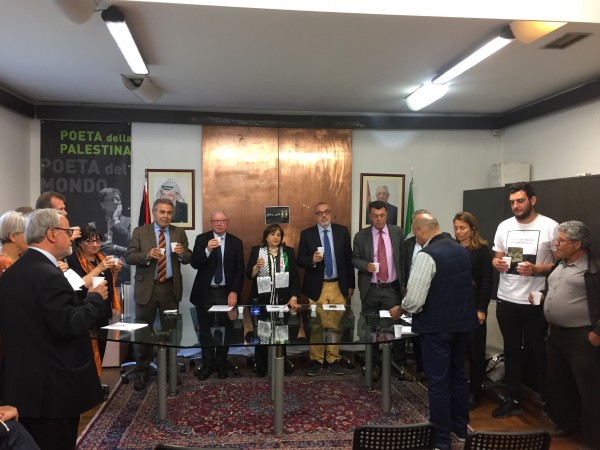 وفي نهاية المؤتمر الصحفي تضامن المتواجدين بشرب " مي وملح" مع أسرانا ، وبعدها تم توزيع الدراسات المعّدة من قبل السفارة عن الاسرى ورسالة الاخ مروان البرغوثي الى البرلمانين مترجمة للايطاليه .