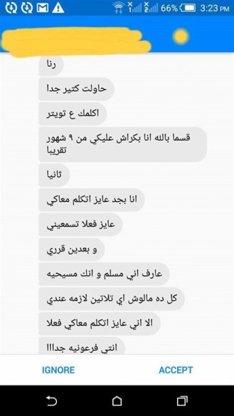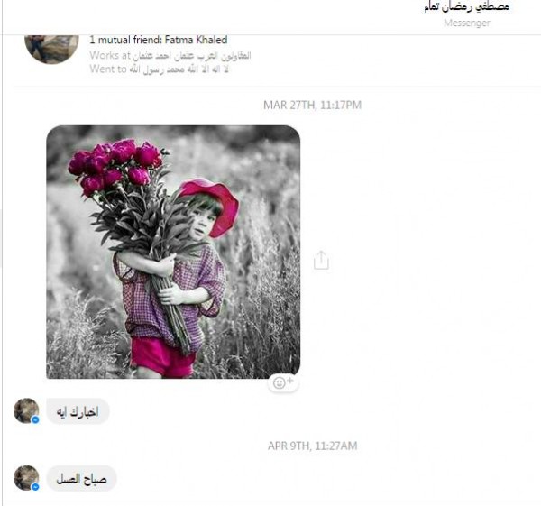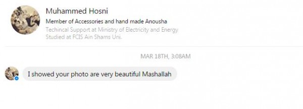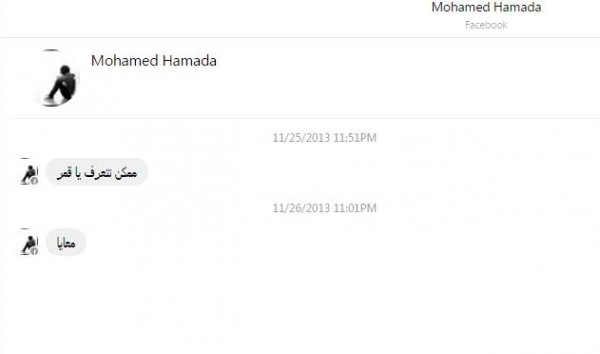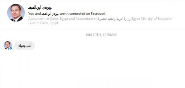 وأضافت نرمين عاطف: «الكلام كله كان مقتصرا على ممكن نتعرف، وهاي»، فيما ذكرت هدى محمد: «من الرسائل اللي اتبعت لي على الفيس بوك.. الله أكبر عليكي انتى مصرية بس شكل ماما أجنبيه»، وتابعت: تلقيت رسالة أخرى تقول «أنا شوفت صورتك انتى جميلة كده أزاى» وعلقت هدى ماعرفتش أرد.