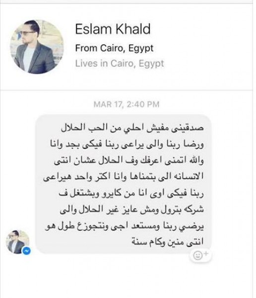 وقالت آيه الجيار: من أطرف الرسائل اللي استقبلتها على الفيس بوك «مافيش أحلى من الحب الحلال، واللي يراعي ربنا فيكي وانتى الإنسانة اللي بتمناها» واكتشفت بعد ذلك أنه أرسلها لعشرة من صديقاتي.