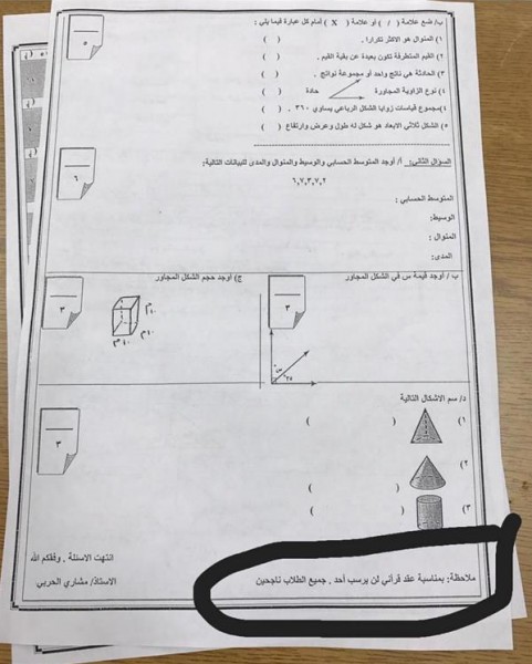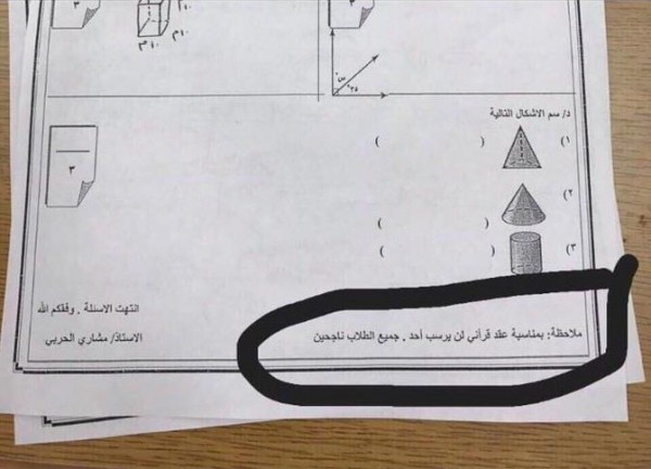 وتداول رواد المواقع صورة لاختبار مادة الرياضيات بأحد الفصول، وقد ذيلها المعلم، ويدعى مشاري الحربي، بملحوظة كتب فيها “بمناسبة عقد قراني لن يرسب أحد.. جميع الطلاب ناجحون”.