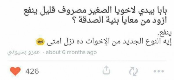 وجاءت إجابته على أحد الأسئلة التي تقول "بابا بيدي لأخويا الصغير مصروف قليل هل ينفع أزود من معايا بنية الصدقة" فأجاب ينفع، وأضاف ساخرا "إيه نوع الإخوات الجديد اللى نزل السوق ده".
