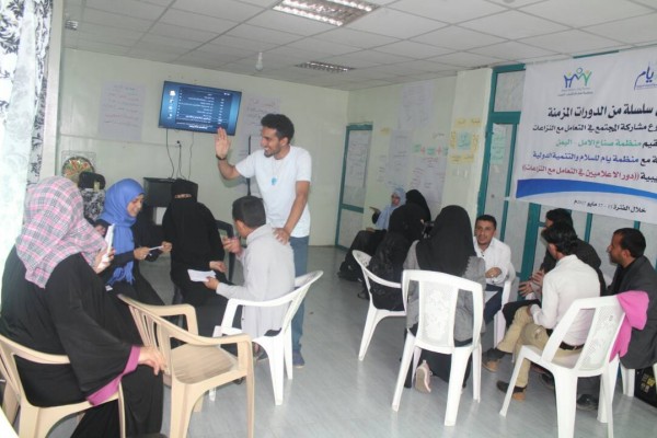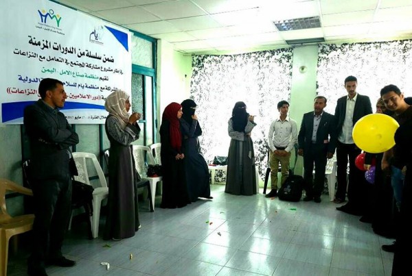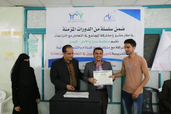 اختتمت منظمة صناع الامل- اليمن بالشراكة مع منظمة يام للسلام والتنمية الدولية الدورة التدريبية الأولى للمرحلة الثانية تحت عنوان (دور الإعلاميين في التعامل مع النزاعات) وذلك في اطار مشروع مشاركة المجتمع في التعامل مع النزاعات واستهدفت الدورة والتي أستمرت ثلاثة أيام على التوالي خلال الفترة 15 - 17 مايو2017م خمسة عشر مشارك ومشاركة من العاملين في مجال الإعلام في أمانة العاصمة.