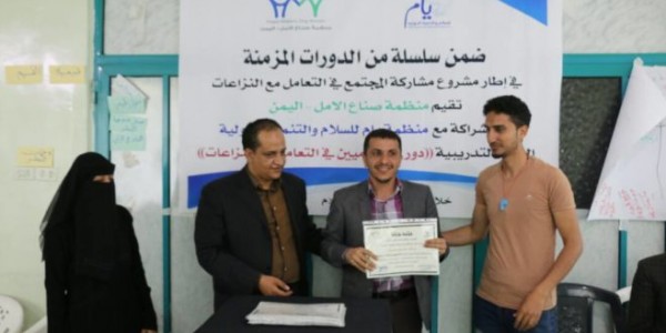 اختتمت منظمة صناع الامل_اليمن بالشراكة مع منظمة يام للسلام والتنمية الدولية الدورة التدريبية الأولى للمرحلة الثانية تحت عنوان (دور الإعلاميين في التعامل مع النزاعات) وذلك في اطار مشروع مشاركة المجتمع في التعامل مع النزاعات واستهدفت الدورة والتي أستمرت ثلاثة أيام على التوالي خلال الفترة 15 _ 17 مايو2017م خمسة عشر مشارك ومشاركة من العاملين في مجال الإعلام في أمانة العاصمة.