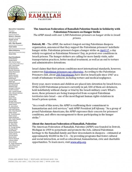 أعلن الاتحاد الأمیرکي لرام الله فلسطين , المنظمة الأطول خدمة في الشتات، أنها تدعم إضراب الأسرى الفلسطينيين المفتوح عن الطعام.