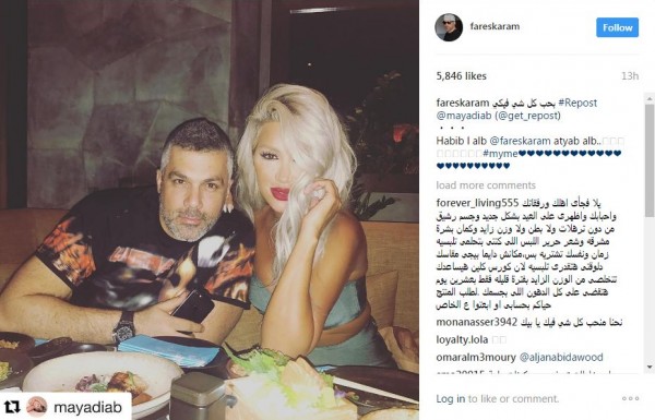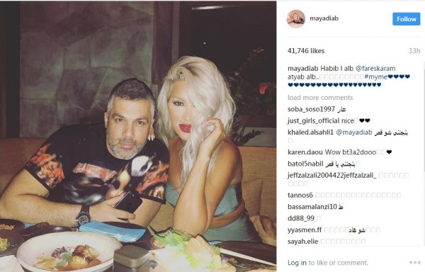 نشرت النجمة اللبنانية مايا دياب صورة عبر موقع انستغرام , تظهر فيها برفقة صديقها المطرب اللبناني فارس كرم خلال تناولهما العشاء، وأرفقتها بتعليق:"حبيب القلب فارس كرم أطيب قلب".