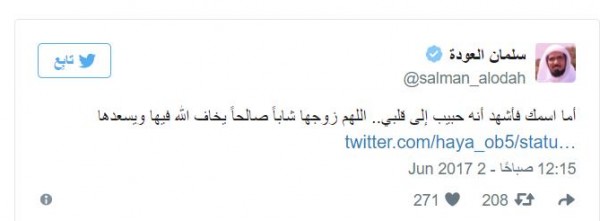 وضعت مغردة تُدعى هياء العبدالله، الداعية السعودي سلمان العودة، في موقف محرج عندما وهبت نفسها له وطلبته للزواج، ولكن العودة لم يتجاهل طلبها حيث قام بالردّ عليها بتغريدة على موقع التواصل الاجتماعي "تويتر".