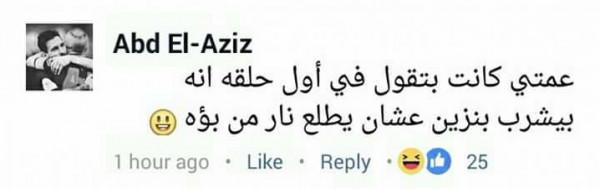وقال عبدالعزيز: "عمتى كانت بتقول في أول حلقة أنه بيشرب بنزين عشان يطلع نار من بؤه"، وأضافت فريدة:"أخويا بيقولي بيشرب أكسجين بقولو هو الأكسجين بيتشرب قالي لا بيتشفط".