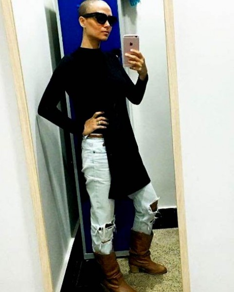 8. شعرها الذي تظهر به في العمل مستعار، حيث فقدت شعرها بالكامل؛ بسبب جرعات الكيماوي.