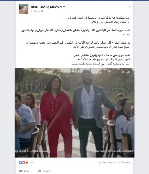 ونشرت "دينا"، صورة لشيرين من الإعلان، عبر صفحتها الشخصية على موقع التواصل الاجتماعي "فيس بوك"، وعلقت عليها قائلة: "اللي بيتكلموا عن حركة شيرين برجليها في إعلان فودافون.. أنا سألت زملاء اشتغلوا في الإعلان.. كعب الجزمة شبك في البنطلون كانت بتخرجه عشان ما تقعش وافتكرت أنه مش هيبان وأنها بتتصور ميديام.. دي غلطة المخرج كان ممكن ياخد الزاوية الثانية في التصوير في الجملة دي وبعدين يرجعلها في اللونج عنده كادرات تانية بخمس كاميرات على الأقل".