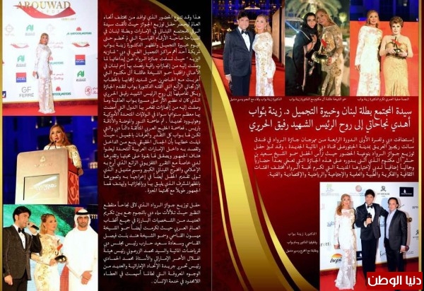 هذا وقد تنوع الحضور الذي توافد من مختلف أنحاء العالم ليحضر حفل توزيع الجوائز حيث تألقت سيدة المجتمع اللبناني في الإمارات وبطلة لبنان في السباحة صاحبة الأرقام القياسية التي لم تحطم حتى اليوم خبيرة التجميل والمظهر الدكتورة زينة بواب شريكة أحد أهم مراكز التجميل الطبي في الإمارات ” شانزيه اليزيه ” حيث تسلمت جائزة الرواد عن إبداعاتها لما وصلت إليه من إنجازات راقية رفعت بها إسم لبنان في الأعالي ترافقها سمو الشيخة عائشة آل مكتوم التي أعربت مع الحاضرين عن شديد إعجابها مع جميع الحاضرين بالخطاب الإرتجالي الرائع التي ألقته الدكتورة بواب حيث قدمت الجائزة وبكل تفاصيلها إلى روح الرئيس الشهيد رفيق الحريري الذي كان له عظيم الأثر على مسيرة بواب العاللمية وما وصلت إليه من إنجازات تفخر بها الدول التي أمضت بها معظم سنواتها الولايات المتحدة الأميركية وهوليوود تحديداً ، ثم عاصمة النور والموضة والأناقة باريس ، فعاصمة الخليج العربي المتألقة دائماً دبي والتي تكن لها بواب كل التقدير والعرفان حيث ذيلت خطابها بأن الجمال الحقيقي ينبع من الداخل وتقصد به داخل الإمارات العربية المتحدة ليعلوا هتاف الجمهور ويصفق لها بقوة على عرفانها بالجميل أينما حلت خاصةً مع التقرير التلفزيوني الرائع الذي أبرع به الإعلامي والمخرج اللبناني الكبير وسـيم منديل و الذي تولى تقديم الحفل أيضاً فيإخراجها وتصويرها بالمظهرالمشرف الذي يليق بها وبإنجازاتها وليهتف لها الجمهور طويلاً مع كلمتها المعبرة.