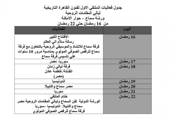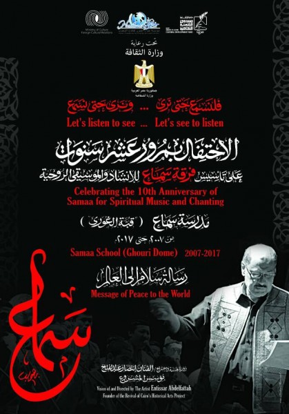 تحت رعاية وزارة الثقافة وبالتعاون مع مؤسسة مصر الخير ومؤسسة حوار لفنون ثقافات الشعوب ووزارة الاّثار وتفعيلاً للمشروع القومى إحياء فنون القاهرة التاريخية الذى أسسه الفنان المخرج انتصار عبد الفتاح وتم تدشينه من خلال احتضان اللجنة القومية لتطوير وحماية القاهرة التاريخية برئاسة المهندس ابراهيم محلب مساعد رئيس الجمهورية للمشروعات القومية والإستراتيجية، تفتتح فعاليات الملتقى الأول لفنون القاهرة التاريخية بعنوان" ليالى المقامات الروحية "ورشة سماع – حوار الأمكنة فى الفترة من 16- 22 رمضان بمسرح بيت الشاعر بشارع المعز فى تمام الساعة 9:30 مساءً، وذلك احتفالاً بشهر رمضان المعظم وبمرور عشرة سنوات على تأسيس فرقة سماع.