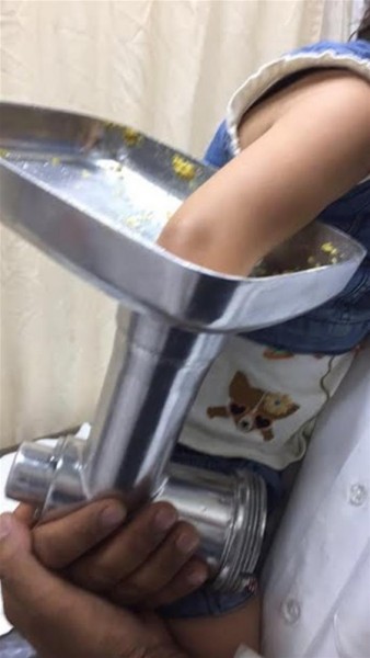 لقطات تحبس الأنفاس: لحظة إخراج يد طفلة من فرامة لحوم