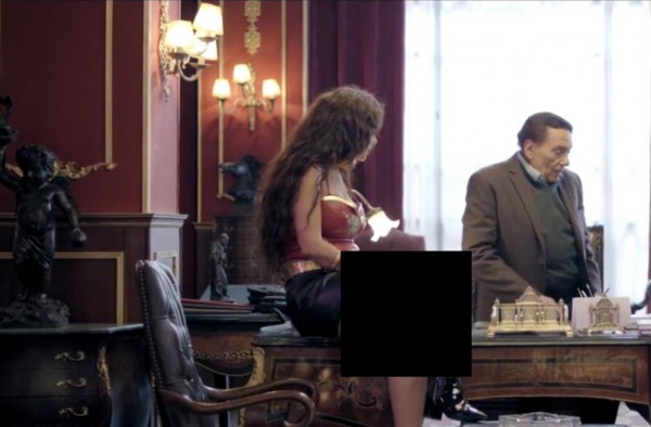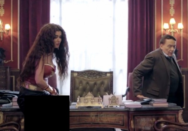 وارتدت غادة بدور "سلا" في مشهد جمعها بـ"الزعيم"عادل إمام تنورة قصيرةً جداً، وجلست على سطح المكتب.