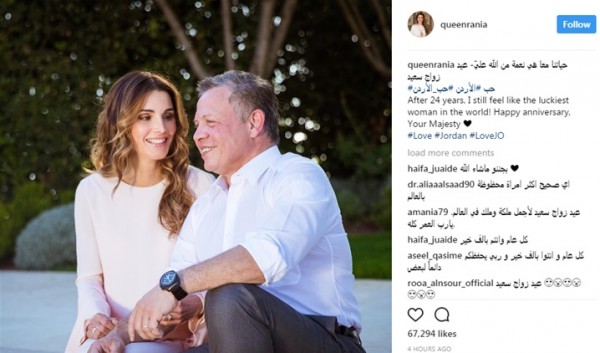 نشرت الملكة الأردنية صورة تجمعها بزوجها الملك عبد الله الثاني، على موقع الصور "انستجرام"، وظهرت الملكة رانيا بتوب باللون الوردي الفاتح، مع الشعر المموج، بابتسامة عريضة تلفت الأنظار.