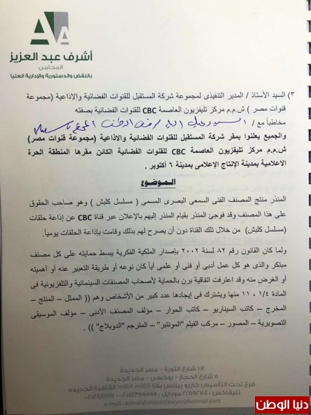 وكانت شركة فيردي للإنتاج الفني للمنتجين محمد عبد الحميد ووائل قد وكلت المحامي أشرف عبد العزيز المحامي بالنقض، لمقاضاة مجموعة قنوات سي بي سي، لقيامها بعرض مسلسل "كلبش" والذي تنتجه الشركة دون إذن كتابي منها بالعرض أو