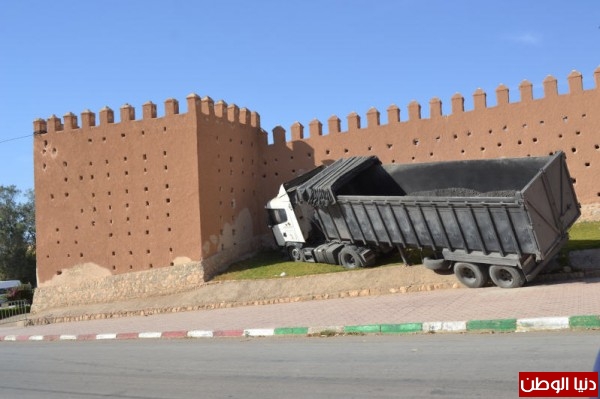 نجاة شاحنة من النوع الكبير لنقل الفحم الحجري بأعجوبة مساء اليوم الخميس 15 يونيو 2017 من قوة الإصطدام بصور القصبة الإسماعيلية وسط مدينة العيون الشرقية