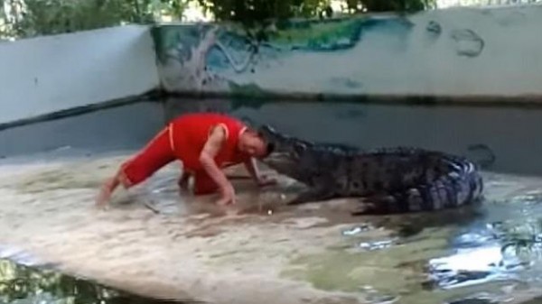 ويظهر الرجل أولا وهو يركع أمام التمساح وهو يلاعبه، ولمدة ليست قصيرة قبل أن يحاول إدخال رأسه بين فكي الحيوان في نوع من ألعاب السيرك، لتحدث الكارثة بعدها.
