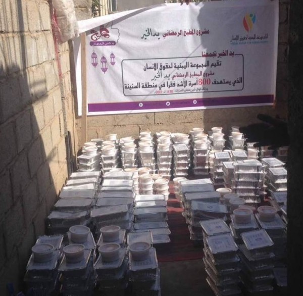 بلغ عدد المستفيدين من المطبخ الخيري الرمضاني الذي يقدم وجبات إفطار يومية توزع على الفقراء في منطقة السنينة بمحافظة صنعاء نحو 800 أسرة من الاسر الفقيرة والاشد فقراً وتنفذة مؤسسة المجموعة اليمنية لحقوق الإنسان ضمن مشاريعها الرمضانية.