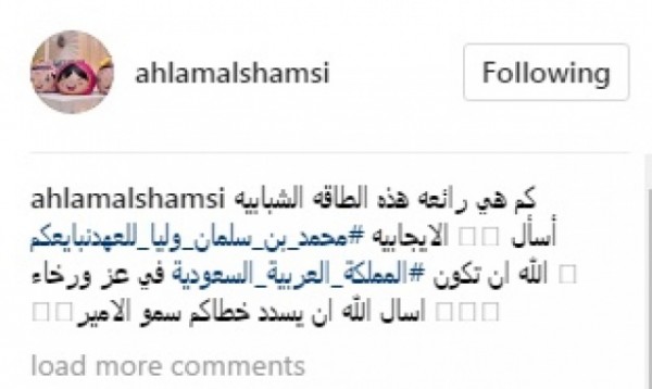 وعلّقت على الصورة، وكتبت: "كم هي رائعة هذه الطاقة الشبابية الايجابية. محمد بن سلمان وليا للعهد نبايعكم. أسأل الله ان تكون المملكة العربية السعودية في عز ورخاء. اسال الله ان يسدد خطاكم سمو الامير".