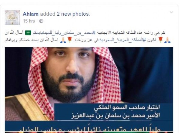 من جهتها، علّقت الفنانة الإماراتية أحلام على الموضوع، ونشرت، عبر حسابها الرسمي على تطبيق "انستغرام"، صورة للأمير، كُتب عليها: "اختيار صاحب السمو الملكي الأمير محمد بن سلمان بن عبد العزيز ولياً للعهد وتعيينه نائباً لرئيس مجلس الوزراء مع استمراره وزيراً للدفاع".