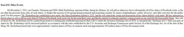 بريسيلا تشان في بيان نشره أمس عن قيامه بالتبرع بـ 99% من أسهمه في شركة فيس بوك (والتي يمتلك 28.2% من أسهمها) والتي تقدر الآن بحوالي 45 مليار دولار أمريكي من أجل مبادرة “تشان زوكربرج” لأنهما يريدان العمل على أن يكون العالم مكاناً أفضل ليمكن لابنتهما العيش فيه، مُضيفاً أن المبادرة تسعى “لتحسين ودعم الإمكانات البشرية ودعم المساواة بين كافة أطفال الجيل القادم”.
