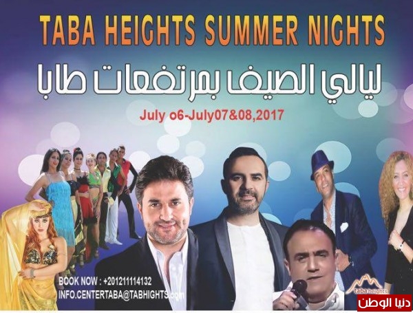 تطلق مجموعة طابا هايتس وفنادقه اول احتفالات الصيف لعام ٢٠١٧ تحت اسم (Summer nights 2017) بمنتجع طابا هايتس خلال الفترة من ٦ الي ٨ يوليو ٢٠١٧ بحضور باقة من نجوم الفن العربي ، حيث يحي الفنان ملحم زين اول ايّام ليالي الصيف ل ٢٠١٧ ويحي الفنان وائل جسار ليلة ٧ من يوليو ٢٠١٧ ثاني ايّام ليالي الصيف ويختتم الفنان الاردني شادي جميل ثالث ايّام احتفالات ليالي الصيف بطابا هايتس لعام ٢٠١٧ بالاضافة الي العديد من الفقرات الفنية والاستعراضية للراقصة الاستعراضية الروسية اوكسانا وغيرها من الفقرات والعروض الفنية.