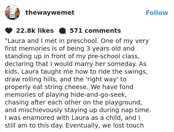 التقى لورا شيل ومات جرودسكي عندما كانا طفلين في الحضانة، وأعلن "مات" أمام زملائه أنه سيتزوج "لورا" يوما ما، لكنهما لم يتواصلا مع بعضهما حتى مرحلة المدرسة الثانوية؛ حيث تمكن صديق مشترك بينهما من استعادة علاقتهما مرة أخرى.