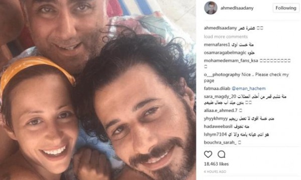 نشر الفنان أحمد السعدني صورة تجمعه بالمؤلف تامر حبيب والنجمة منة شلبي على أحد شواطئ الساحل الشمالي.