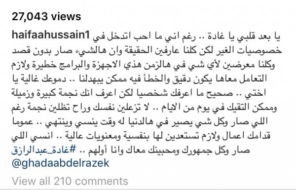 قامت الممثلة البحرينية هيفاء حسين بدعم الممثلة المصرية غادة عبد الرازق وتوجيه رسالة لها، حيث نشرت عبر صفحتها الخاصة على احد مواقع التواصل الإجتماعي، مقطع فيديو من بكاء غادة وإعتذارها للجمهور، وعلّقت عليه قائله إنها لا تُحب التدخل في خصوصيات أحد ولكن الجميع يعلم أن ما حدث كان دون قصد، فهذا عيب الأجهزة الحديثة والتكنولوجيا فعلى الجميع التعامل معها بحذر لأن الخطأ فيها كبير.