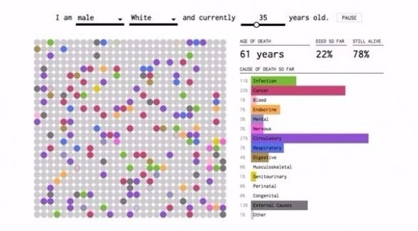 ويمكن استعمال الأداة ببساطة والاستفادة منها عن طريق إدخال الجنس والعرق والعمر، بحيث تمثل كل نقطة محاكاة لحياة واحدة للمستخدم، ومع مرور الأعوام عاماً بعد عام تنتهي حياة جرى محاكاتها، وتتوافق الألوان مع سبب الوفاة، وتتبع المؤشرات الموجودة على اليمين على شكل قضبان النسب المئوية التراكمية ليظهر في النهاية النسب المتعلقة بكل سبب من أسباب الموت الموزعة ضمن 15 فئة.