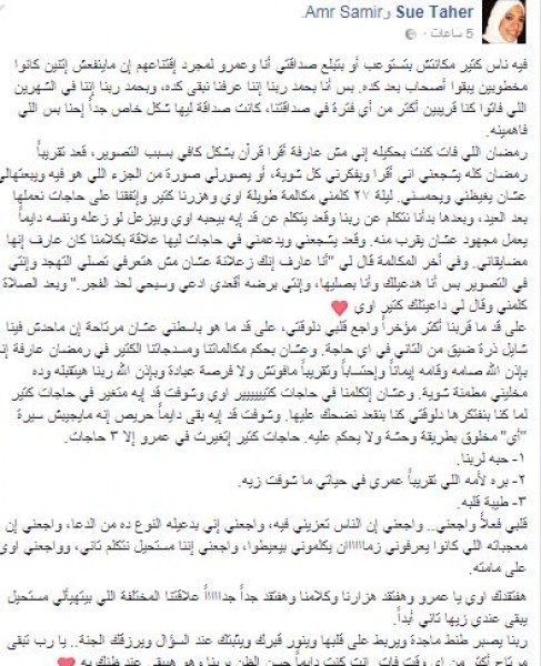 وكتبت «إسراء» عبر حسابها الشخصى على موقع التواصل الاجتماعي «فيس بوك» في رسالتها، قائلة: «فيه ناس كتير مكانتش بتستوعب أو بتبلع صداقتي أنا وعمرو لمجرد اقتناعهم إن مينفعش اتنين كانوا مخطوبين يبقوا أصحاب بعد كده، بس أنا بحمد ربنا إننا عرفنا نبقى كده، وبحمد ربنا إننا في الشهرين اللى فاتوا كنا قريبين أكتر من أي فترة في صداقتنا، كانت صداقة ليها شكل خاص جداً إحنا بس اللى فاهمينه».