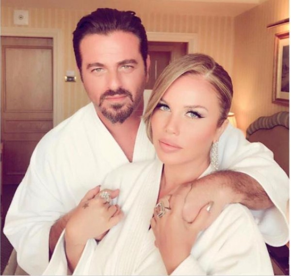وظهر الزوجان بالصورة بثوبي إستحمام، ويحضن الخال سابا من الخلف.