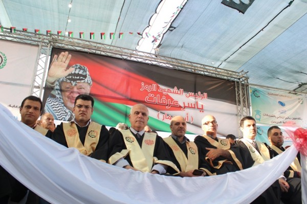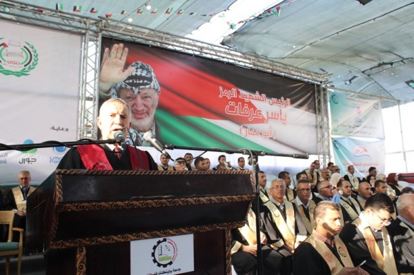 ثم ألقى الأستاذ الدكتور عماد الخطيب رئيس جامعة بوليتكنك فلسطين كلمة رحب فيها بالحضور في جامعة بوليتكنك فلسطين، وقال: "نحن نشارك طلبتنا الأعزاء وأهاليهم فرحة يوم الحصاد وقطف ثمار جهد سنوات قضوها على مقاعد الدراسة وفي المختبرات والمشاغل والميدان ينهلون من المعرفة ويصقلون شخصياتهم قبل بدئهم حياتهم العملية ليساهموا في بناء مجتمعهم ووطنهم. ونحن حققنا نجاحات عديدة خلال العام الأكاديمي الحالي، فعلى الصعيد الأكاديمي لا تزال جامعتنا تطور البرامج المتمُيّزة على مستويات الدبلوم والبكالوريوس والماجستير وبكافة التخصصات الحديثة، وقبل أيام فقط حصلنا على إعتماد لعدة برامج منها هندسة الطاقة المتجددة وريادة الأعمال والتربية الأسرية، إضافة لمجموعة من البرامج التي تسير ضمن إجراءات الإعتماد الرسمية ومنها برامج الطب وعلوم الصحة والحياة وبرامج العلوم الإدارية لمستويات البكالوريوس والماجستير وبرنامج الدكتوراة المشترك في المعلوماتية. أمّا على الصعيد البحثي فقد سجلت جامعتنا إنجازات هامة سواء في النشر العلمي المُتميّز أو من خلال المشاركة في مؤتمرات علمية إقليمية ودولية أو من خلال حصد الجوائز الإقليمية والدولية العديدة، وكانت الإضاقة النوعية إطلاق جامعتنا جوائز البحث العلمي المُمولة من البنك الإسلامي الفلسطيني والتنافس عليها بين الجامعات والمؤسسات البحثية الفلسطينية لتكون جائزة وطنية مُعتبرة. وعلى صعيد البنية التحتية، فقد شهدت جامعتنا تطوراً نوعيا وكمياً في هذا المجال بدأ من مبنى منيب رشيد المصري للإبداع والتميّز ومبنى المركز الفلسطيني-الكوري الوطني للتكنولوجيا الحيوية اللذين شارفاً على الإنتهاء أما المباني التي سيتم البدء بالعمل فيها فهي مبنى الخدمات الطلابية متعدد الأغراض الذي سيحتوى ملاعب وقاعات للنشاطات الطلابية ومكتبة الجامعة وكافتيريا حديثة، إضافة لهذا فقد وضعنا حجر الأساس لمشروع مباني مُجمّع العِزَّة الطِّبي على أرض نمرة وهذا المجمع سيخدم البحث العلمي وبرامج الطب وعلوم الصحة والحياة إضافة لخدمته المباشرة للقطاع الصحي الوطني. ولا بد لي في هذا المقام من أن أتوجه بشكري لكل من ساهم وتبرع من ماله لأعمال البناء والتشطيب راجياً من العلي القدير أن يكون تبرعهم في ميزان حسناتهم كما وأغتنم هذه المناسبة الخيرة لدعوة الخيرين من أبناء هذه المحافظة الطيبة ، وهم كثيرون ، للمشاركة في هذا الجهد الخير والذي يخدم أبناءنا وبناتنا ومعهم مجتمعنا وأمتنا. كما أنه لا بد من الإشارة هنا لعلاقات التعاون المُتميزة لجامعتنا مع مؤسساتنا الوطنية التي نعتبرها شريك أساسي في بناء الإنسان الذي يمثل أغلى ما نملك، ونقدر للقطاع الاقتصادي الخاص دوره ومبادراته المتعددة ، مع أننا نطمح في المزيد من التعاون والشراكة في كل ما يساهم في تنمية مجتمعنا".