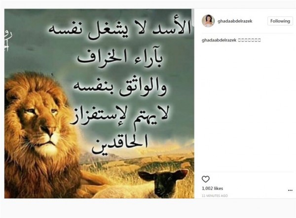 نشرت الفنانة غادة عبد الرازق، صورة جديدة على صفحتها الخاصة بموقع إنستجرام، وعلقت عليها قائلة: «الأسد لا يشغل باله بآراء الخراف".