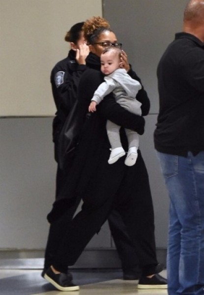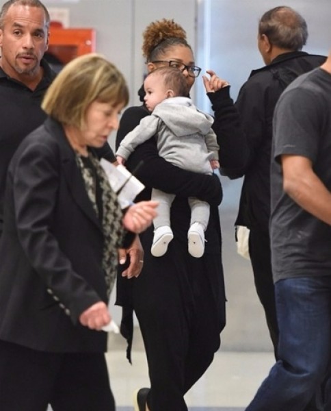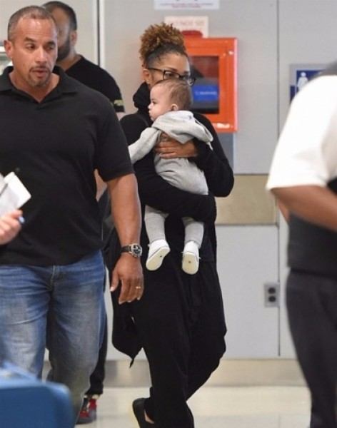التقطت عدسات المصورين صوراً للمغنية الأميركية جانيت جاكسون وهي تحمل طفلها عيسى في المطار أثناء عودتها إلى مدينة نيويورك للمرة الأولى بعد ولادته.