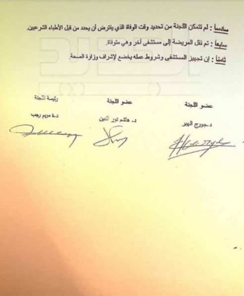 ولفت المحضر الى أنّ التقنيات المستعملة متعارف عليها طبياً والمستشفى يعمل تحت إشراف وزارة الصحة، والمريضة خضعت لمراقبة بعد العملية، إضافةً الى أنّها نُقلت الى مستشفى آخر وهي متوفاة، من دون تحديد وقت الوفاة، الذي يكشفه الاطباء الشرعيين.
