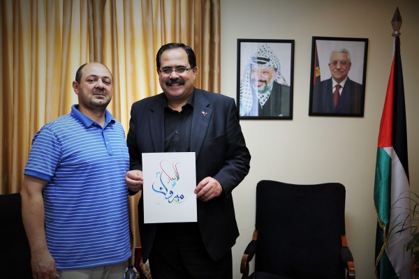 وأثناء اللقاء قدَّم داري عرضاً لكتابة لوحة قدمها هدية للوزير صيدم، كتب عليها "مبروك الإنجاز"